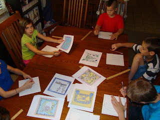 Then we used this basic lesson by Amy Bruce to learn about illumination. Following the directions in this lesson we made our own illuminated letters. On a square sheet of drawing paper the kids used rulers and pencils to create a border.Next they chose a letter (they all chose the first letter of their name) and wrote it large in the center of the page.