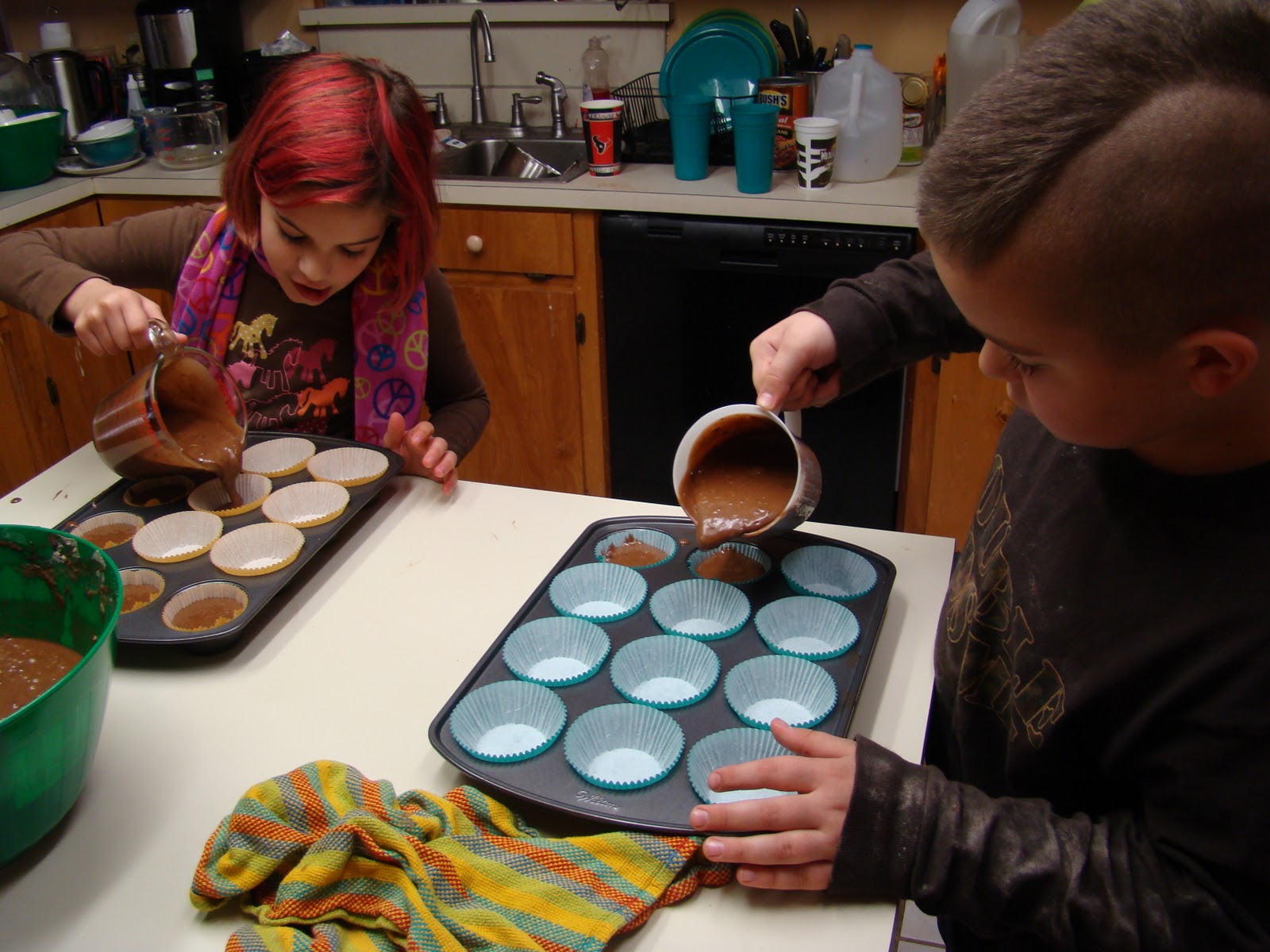 The batter was really liquidy (it's supposed to be) so we filled up measuring cups with spouts so the kids could easily fill each muffin cup to 2/3 full.